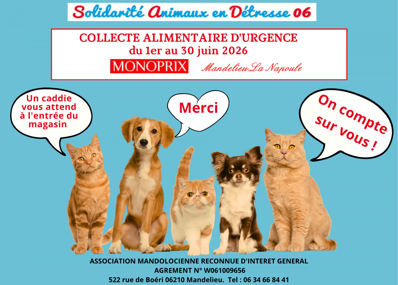 L'association capitoulane SOLIDARITE ANIMAUX EN DETRESSE 06 organise sa GRANDE COLLECTE ALIMENTAIRE à MONOPRIX du 1er au 30 juin 2026 en faveur des 900 chats et chiens bénéficiaires sous son aile protectrice. Vous pourrez déposer des croquettes, boîtes, biscuits dans le caddie se trouvant à l'entrée du magasin. Merci pour votre générosité !